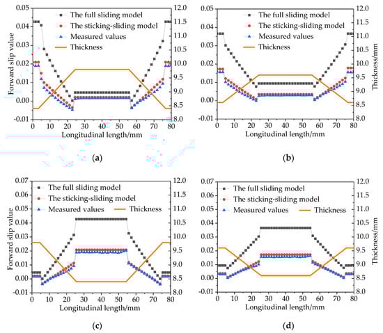 The longitudinal length of the specimens in each rolling stage is predicted by the sticking-sliding model. The results of the sticking-sliding model, the results of the full sliding model, and the measured results are compared, as shown in Figure 11.