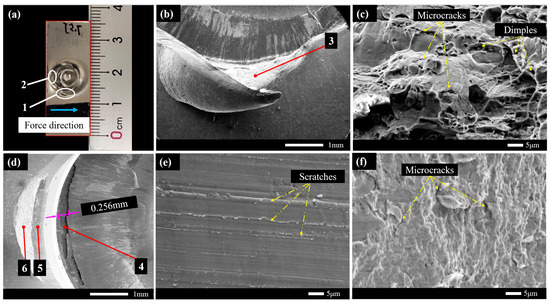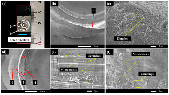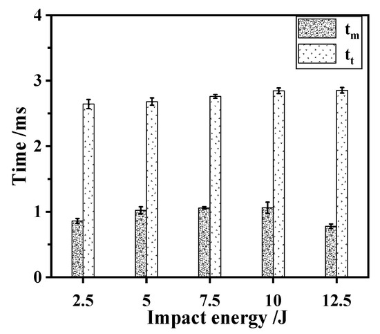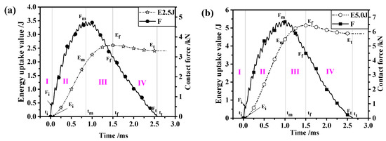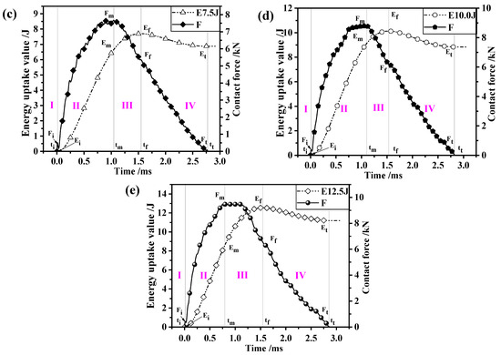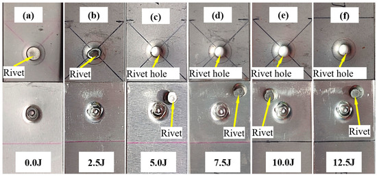 - For the impacted joints, when there is no visible crack in the appearance of the joints, the variations of the Contact Force/Energy uptake value–time curves of the SPR joints are similar. The parameters, such as total uptake energy value (Et), maximum uptake energy value (Ef), and maximum contact force (Fm), of the joints are increased gradually with increasing the impact energy. When the incident energy is 12.5 J, the total value of Et is 11.254 J, the maximum value of Ef is 12.547 J, and the maximum value of Fm is 9.481 kN.