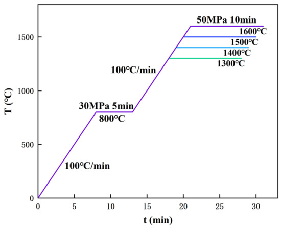 Diffusion bonding is carried out under a vacuum condition with a vacuum level of 10 Pa. In the present study, the applied temperature for vacuum diffusion bonding was in the range of 1300–1600 °C. Figure 3 shows the sintering parameters for diffusion welding of the ODS-W/TZC connector, and the sintering procedure is described as follows. The sample underwent heating at a heating rate of 100 °C/min until the temperature reached 800 °C, and the temperature was maintained at 800 °C for a period of 5 min. After that, the temperature continued to increase at the same heating rate of 100 °C/min until the desired temperature was reached, and the desired temperature was maintained for an additional 10 min. Then, the specimen was cooled down to room temperature in the smelter. The starting pressure was set to 10 MPa, gradually increasing to 30 MPa when the temperature fixed at 800 °C. The pressure then further elevated to 50 MPa when the final desired temperature was maintained.