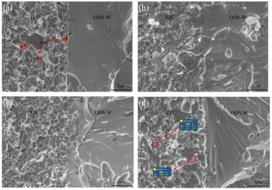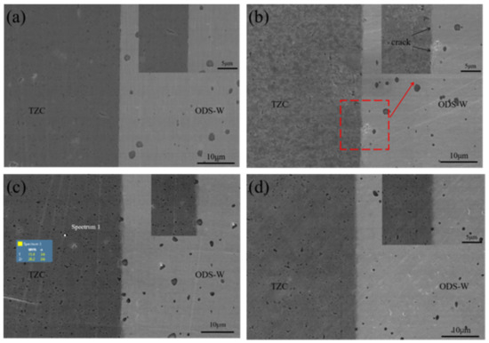 SEM images of the ODS-W/TZC connectors bonded at four different temperatures: (a) 1300 °C, (b) 1400 °C, (c) 1500 °C, and (d) 1600 °C. The red square in Figure 4b shows that some cracks appeared at the interface.