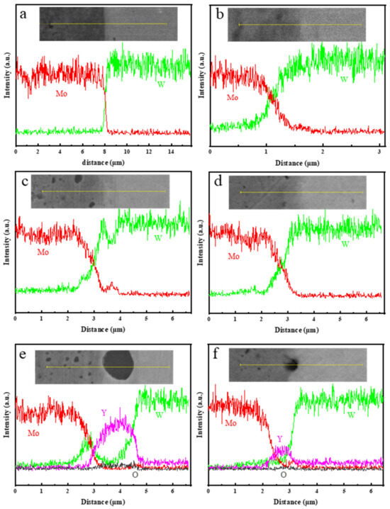 (a–d) Elemental distribution curves (Mo and W) across the ODS-W/TZC interface which was bonded at four different temperatures: (a) 1300 °C, (b) 1400 °C, (c) 1500 °C, and (d) 1600 °C. (e,f) Elemental distribution curves (Mo, W, Y, O) in the Y2O3 particles at the interface of ODS-W/TZC joints at sintering temperatures of (e) 1500 °C and (f) 1600 °C.