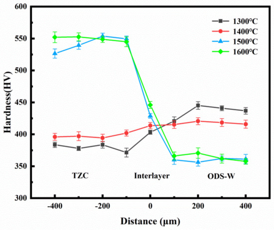 The Vickers hardness tester was employed to evaluate the hardness of ODS-W/TZC joints fabricated at different sintering temperatures. The hardness measurements were performed in line scan mode, where the interface is taken as the origin and extends separately to 400 μm for each substrate. Each sampling point was spaced by a distance of 100 μm and a total of 9 sampling points were measured. The hardness was measured by applying a load of 300 g at each sampling point and maintaining this for a period of 10 s. Figure 6 depicts the variation of the measured hardness in the vicinity of the interface of ODS-W/TZC connectors at various sintering temperatures. It can be seen from Figure 6 that the raise in sintering temperature lead to an increase in the hardness of the TZC substrate. The increased hardness of the TZC substrate may be due to the enhanced degree of densification of the TZC substrate at higher temperature, shown in Figure 4 above. In particular, the hardness of the ODS-W substrate side decreased significantly when the sintering temperature was above 1500 °C. This is because that the recrystallization temperature of ODS-W is about 1500 °C [8,9,10], and the occurrence of recrystallization can significantly reduce the strength and hardness of the ODS-W. In addition, it was found that the hardness value at the interface of joint was between the hardness values of the two substrates when the sintering temperature was above 1500 °C. Such a scenario can be explained as follows. On the one hand, since the W and Mo atoms are miscible, diffusing to form a solid solution rather than the metallic alloys at the interface; thus, the hardness will not remarkably increase [31,32]. On the other hand, the thickness of the diffusion layer at the interface is about 2 μm, and the measurement of hardness through Vickers indentation at the interface is influenced by both substrates [33]. When sintered at 1600 °C, a maximum hardness of 446 HV is achieved at the interface of the ODS-W/TZC connector.