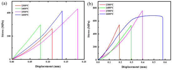 Considering that the thickness of the SPS sintered specimen was limited, here, the tensile direction of the ODS-W/TZC joint was in a direction parallel to the interface of the ODS-W/TZC joint. The tensile properties of the joints were measured via a universal testing machine at both an ambient temperature and elevated temperature of 500 °C. Figure 7a,b display the stress–displacement curves of the ODS-W/TZC joint at room temperature and 500 °C, respectively. It is shown that the tensile strengths of the samples sintered at 1300 °C and 1400 °C are relatively lower, which can be ascribed to the poor densification of TZC substrate after sintering [see Figure 4a,b]. Among all the tensile data at different sintering temperatures, it is observed that the ODS-W/TZC connector bonded at 1500 °C exhibited the best tensile performance both at room temperature and elevated temperatures, with a tensile strength of 459 MPa at room temperature and 786 MPa at a temperature of 500 °C. This is because ODS-W and TZC materials have the best connection effect at temperature of 1500 °C, as shown in Figure 4c. As can be inferred from the previous analysis, recrystallization of the ODS-W occurs at a temperature of about 1500 °C [8,9,10], which weakens the tensile performance of the joint. Therefore, the tensile strength of the ODS-W/TZC connector sintered at 1600 °C slightly decreased compared to that sintered at 1500 °C.