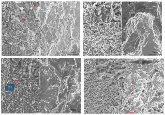 The fracture morphologies of the ODS-W/TZC joints sintered at 1300 °C, 1400 °C, 1500 °C, and 1600 °C under tension at room temperature are displayed in Figure 8a–d, respectively. It was observed that the fracture morphology on the TZC side was significantly different from that on the ODS-W side. As depicted in Figure 8a, there existed numerous holes on the fracture surface of TZC side at 1300 °C. This result indicates that the densification of TZC side is lower when sintered at 1300 °C, which agrees well with the microstructure presented in Figure 4a. In addition, a clear dividing line was observed at the interface [see Figure 8a], indicating that the ODS-W and TZC materials were not tightly connected. At a sintering temperature of 1400 °C, the number of holes on the TZC side decreased significantly and an effective connection was formed between the ODS-W and TZC materials [see Figure 8b]. When the ODS-W/TZC joint was sintered at 1500 °C, there were no obvious holes on the TZC side and the fracture morphology on the TZC side mainly comprised intergranular fractures [see Figure 8c]. Meanwhile, the grain size on the TZC side was very refined at 1500 °C [see Figure 8c], which can also explain the best tensile performance of ODS-W/TZC joint at this temperature [see Figure 7]. At a sintering temperature of 1600 °C, the TZC side exhibited a mixed fracture mode of transgranular and intergranular fractures. The insert map in Figure 8d shows the elemental composition of intergranular and transgranular cracks. Pure Mo is detected in the transgranular crack, while pure Ti is found in the intergranular crack, which suggests that the doping of carbides is capable of enhancing grain boundary cohesion and hence improves the material strength. As seen in Figure 8a–d, the fracture morphologies on the ODS-W side are primarily the cleavage fracture at all sintering temperatures.
