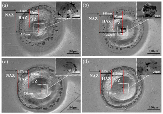 Figure 10 illustrates the surface morphology of the ODS-W/TZC joint subjected to a transient laser heat load. The panels (a)–(d) in Figure 10 correspond to the samples fabricated at temperatures of 1300 °C, 1400 °C, 1500 °C and 1600 °C, respectively. After thermal shock, the surface can be mainly classified into three regions from the center to the outward edge of the ODS-W/TZC joint, i.e., the fusion zone (FZ), heat affected zone (HAZ), and unaffected zone (NAZ) [38]. As seen in Figure 10a,b, there was no obvious difference between the damaged areas of the ODS-W/TZC joints prepared at 1300 °C and 1400 °C. For instance, both the FZ diameters of the joints fabricated at 1300 °C and 1400 °C were around 80 μm, and their HAZ diameters were in the range of 130–140 μm. In addition, there was also no obvious difference between the damaged areas of the ODS-W/TZC joint prepared at 1500 °C and 1600 °C, as shown in Figure 10c,d. Comparing the damaged areas of the ODS-W/TZC joints fabricated at different temperatures, it can be found that the FZ diameter of the connectors at the higher temperatures of 1500 °C and 1600 °C (about 120 μm) was much larger than those at the lower temperatures of 1300 °C and 1400 °C (about 80 μm). However, the HAZ diameter of the connectors fabricated at the higher temperatures of 1500 °C and 1600 °C was obviously smaller than those at the lower temperatures of 1300 °C and 1400 °C. When comparing the surface damage of the ODS-W subjected to transient laser heat loading [39] with that of the connector, it can be observed that the diameter of the damaged region in the connector was larger. However, unlike the ODS-W sample [39], no cracks were detected in the damaged region of the connector.