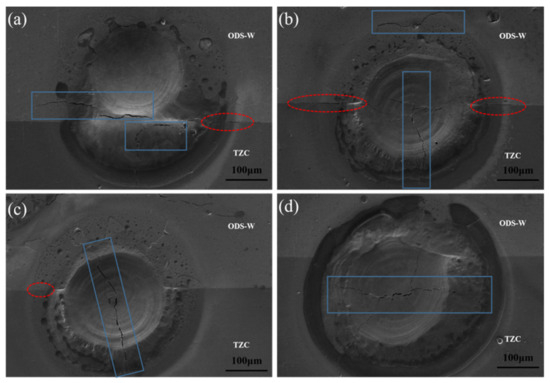 The surface morphologies of ODS-W/TZC joints fabricated at four different sintering temperatures after transient laser thermal load: (a) 1300 °C; (b) 1400 °C; (c) 1500 °C; (d) 1600 °C.