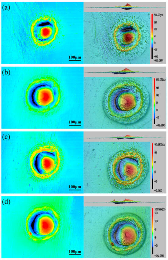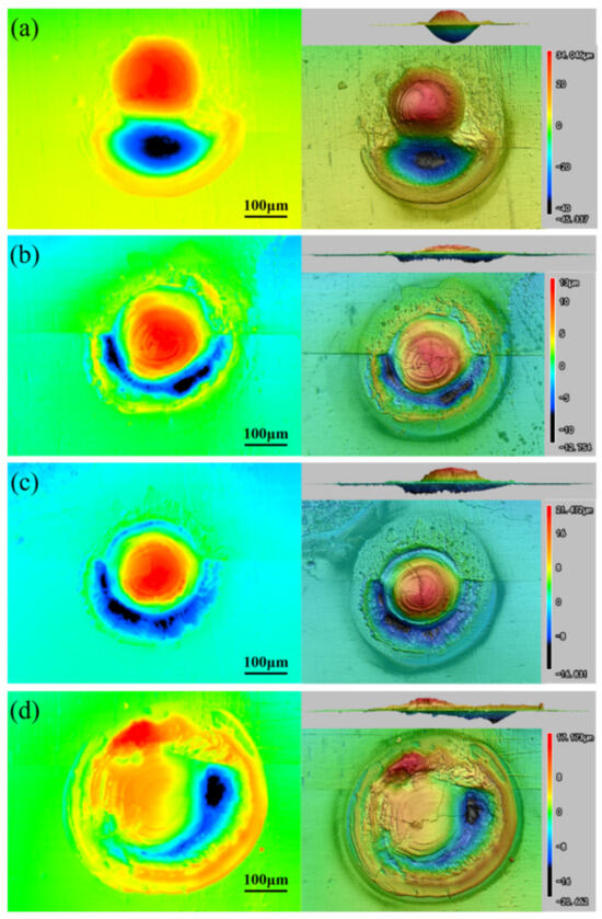 The 3D height diagrams of the surface of the ODS-W/TZC joint fabricated after transient laser thermal load at the following four different sintering temperatures: (a) 1300 °C; (b) 1400 °C; (c) 1500 °C; (d) 1600 °C.