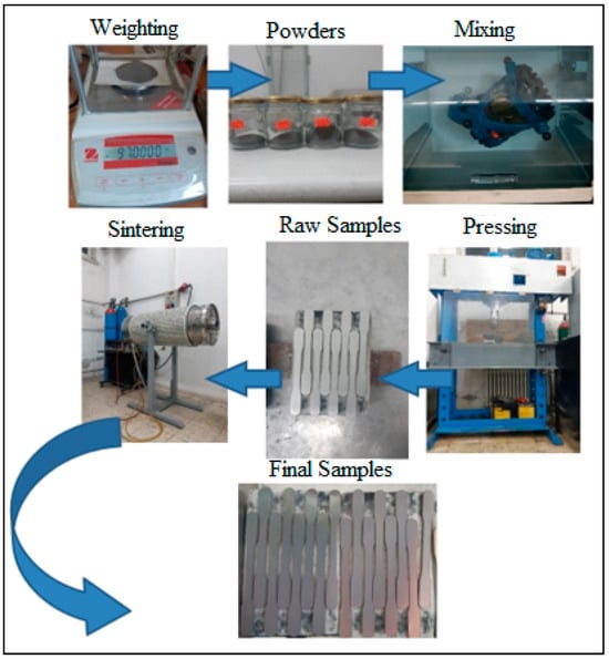 The weighing of the powders was carried out using a RADWAG AS.60.220 C/2 brand digital precision balance with an accuracy of 0.0001, in line with the amount given in Table 2, and the weighed powder mixtures were blended with balls for two hours using a Willy A. Bachofen AG T2F Turbula brand triaxial mixer for homogeneous mixing. Figure 1 shows the stages of work to prepare samples using the PM metallurgy method, where the process begins with weighing the dust of Ti, Mn and 316 L. After the weighing process, the mixing process, which lasted for two hours, was started in the triaxial mixer, then the pressure process was initiated to transform the powder into a solid mixture using the mold prepared in the dimensions of the standard tensile test sample prepared according to ASTM E8M [15]. The samples at this stage are green; that is, their mechanical properties are weak. It was then heated to the sintering temperature of 1250 °C, with the temperature gradually increasing by 5 °C per minute. It was kept at this temperature for 2 h. Then, the cooling process was carried out under the same conditions. At this stage, which is called sintering, argon was used as the shielding gas (see Figure 1).