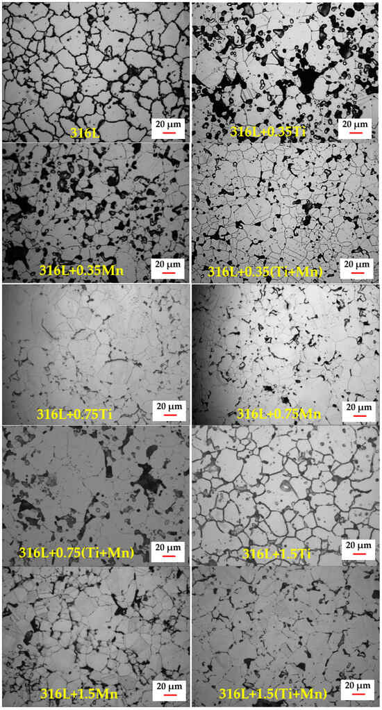 The microstructure images of the samples produced via the PM technique were taken at a pressure of 750 MPa and sintered in an atmosphere of argon at a temperature of 1250 °C for two hours. Figure 3 shows the optical microscope images of the samples produced by the PM method before and after the alloying elements (Ti and Mn) were added.