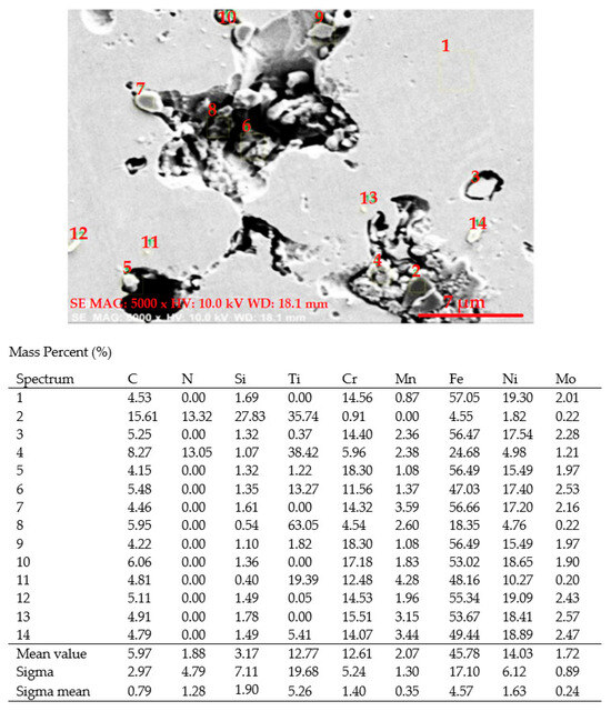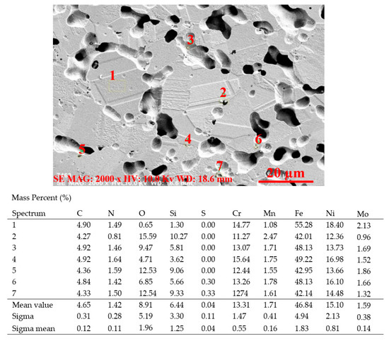 It can be noted from the table that the relative density decreases with the increase in the weight percentage of the alloying elements (Ti-Mn) compared to Alloy I, which represents the stainless steel alloy without the addition of (Ti-Mn). For example, when Ti was added in certain proportions (0.35–0.75 and 1.5 wt %), a decrease was observed in the relative density of samples (Alloys II–V and VI) % of the original sample without addition (Alloy I), and the reason for this is because the addition of Ti and Mn leads to an increase in porosity. There are studies in the literature that demonstrate that the addition of alloying elements increases porosity. For example, Erden et al., in their study, determined that the addition of Mo to unalloyed steel increases the number of pores [21], while the porosity increases with the increase in the weight percentage of the alloying elements. For example, when the two elements (Ti-Mn) were added, the relative porosity increased from 8.06% in Alloy I to which alloying elements the samples (Alloy IV–VII and X) were added 9.11–9.21 and 12.01% in, respectively. On other hand, it can also be seen in Table 3 that the average grain dimensions in the microstructure of stainless steel 316 L become smaller when adding alloying elements (Ti, Mn) with a small weight ratio (0.35 wt %) compared to the basic stainless steel (Alloy I), whose average grain dimensions are 21.25 μm, as the average grain dimensions increase in Alloy II, III, and IV (20.45–19.46 and 19.01) μm, respectively. This is explained by the formation of the precipitates of carbides and nitrides such as TiC(N), MnC(N), and TiMnC, which have a relatively small size and are located on the grain boundaries, causing an obstruction to the expansion of the grain boundaries during recrystallization and the formation of the austenitic phase, which leads to a decrease in the size of the grains compared to the size of the grains in Alloy I, which does not contain additional elements. It was noted that the effect of alloying elements is greater in Alloy IV because three types of precipitates are formed, namely titanium carbide and nitride TiC(N); manganese carbide and nitride MnC(N); and titanium and manganese carbide nitride TiMnC(N), which leads to a greater impediment to the expansion of the grain boundaries in the stage of crystallization in the austenitic phase. Thus, smaller grains are formed. Whereas when the weight percentage of the alloying elements is increased to above (0.35 wt %) to become (0.75 wt %) in Alloys V, VI, and VII, the grain size becomes larger, respectively, and with the continuation of the increase in the weight percentage of the alloying elements to 1.5%, significant increases in the size of the granules to 23.43−28.38 μm, and 31.51 μm were noted. This is explained by the fact that when alloying elements are added in large proportions by weight, this leads to the formation of precipitates with large grains in the austenitic phase, which causes gaps in the crystalline structure. It can be noted that the largest size of the grains was in Alloy VIII, which contains 1.5% titanium. From Figure 4, which depicts the SEM image and the EDS point of the basic Alloy I, it can be seen that at the matrix there is an amount of iron and carbon, indicating the precipitation of cementite (Fe3C). Different precipitates were observed. For example, when spectrum 4 is examined, it can be observed that levels of Cr, Si, Mo, N, and C are high. Here, it is considered to be a precipitate of CrSiMoC(N). As a matter of fact, it has been stated in the literature that binary and multiple precipitates are formed in the matrix and grain boundaries [21].