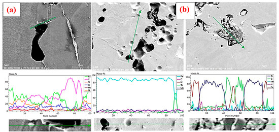 Figure 5 shows the SEM microstructure image taken from Alloy X with 1.5% (Ti + Mn) added. It was observed that new precipitates such as TiC(N), MnC(N) and TiMnC (N) were formed from the received point EDSs. Figure 6 presents the results of the EDS line analysis of Alloy I and Alloy X, which shows the presence of Ti and Mn elements on the precipitates in the form of TiC(N), MnC(N), and TiMnC(N).