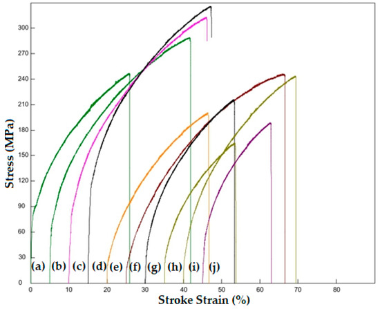 Tensile curves of 316 L PM steels containing different ratios of Ti-Nb (a—16 L; b—16 L + 0.35 Ti; c—16 L + 0.35 Mn; d—16 L + 0.35 (Ti + Mn); e—16 L + 0.75 Ti; f—16 L + 0.75 Mn; g—16 L + 0.75 (Ti + Mn); h—16 L + 1.5 Ti; i—16 L + 1.5 Mn; j—16 L + 1.5 (Ti + Mn)).