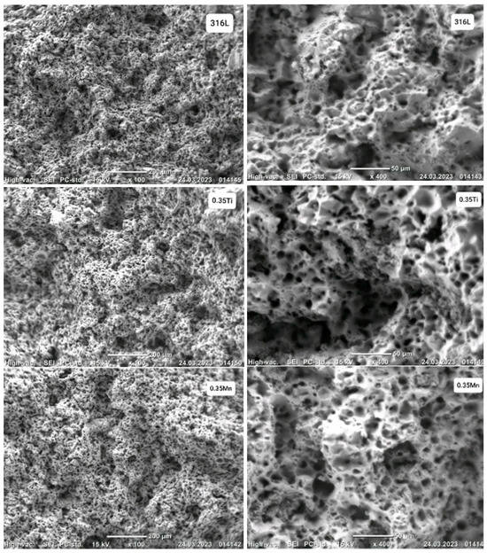 After the tensile test, fracture surface images of unalloyed PM, PM 316 L, and Ti-Mn added 316 L PM steel samples sintered at 1250 °C were taken. Figure 8 shows the fractured surface images. As seen in the SEM images of 316 L steel samples with different Ti-Mn contents (Figure 8), all of the fractured surfaces with pores exhibited partially ductile (honeycomb) and partially brittle (cleavage planes) structures. It was clearly seen that there were pores on all the broken surfaces. This shows that the fractures occur through the coalescence and propagation of microvoids.