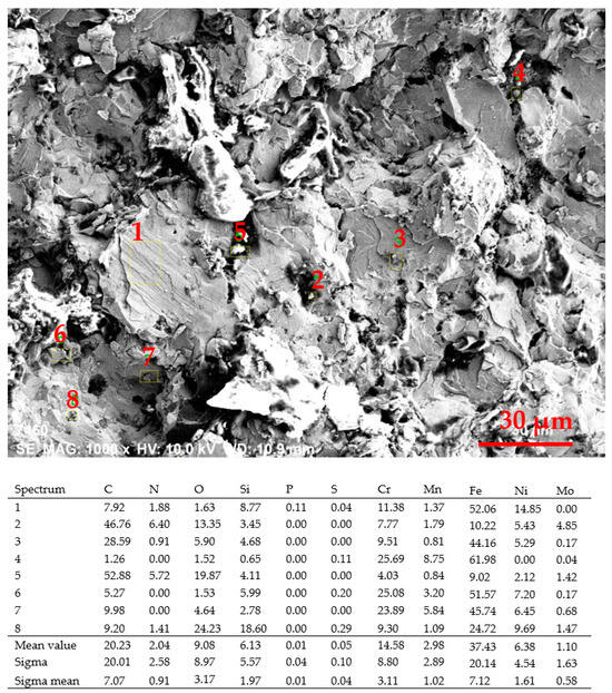 Additionally, large voids were observed in alloyed 316 L steel samples containing 0.35–0.75 and 1.5 wt % Ti, Mn, and (Ti-Mn). These voids are indicative of the removal of precipitates such as TiC, TiN, MnC, MnN, and TiMnC(N) by pulling them under heavy tensile loading conditions. Shanmugasundaram and Chandramouli [32] found that such voids were formed on the fracture surfaces of powder metallurgy steel containing Cr, Ni, and Mo. This has been attributed to carbide formation and the detachment of carbide from the surface during heavy deformation. Figure 9 shows the fracture surface and point EDS results for Alloy VIII.