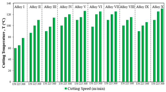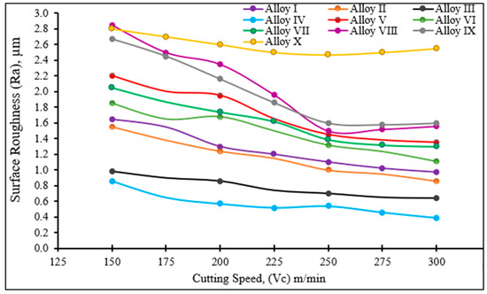 Upon examination of Figure 10, it is evident that the highest surface roughness value is consistently observed at a cutting speed of 150 m/min across all samples. Analyzing the measurements taken from tests conducted on all samples (Alloy I-X), we observe a reduction in Ra of 27.27%, 25.80%, 24.87%, 39.53%, 25.02%, 18.91%, 20.97%, 31.22%, 30.33%, and 10.71% as the cutting speed increases from 150 to 225 m/min, respectively. A 100% increase in the cutting speed results in a Ra reduction of 41.21%, 44.51%, 35.02%, 54.65%, 38.63%, 39.72%, 36.58%, 45.26%, 40.07%, and 8.92% across all samples. The trend across all samples (Alloy I-X) is a decrease in Ra as the cutting speed rises. This trend may be attributed to the reduction in the tool–chip contact area and the diminishing shear strength of the material due to the increased temperature with higher cutting speeds [6,35].