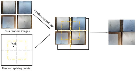 The slabs were sampled from an industrial production, and then were completely polished and smoothed. To make this distinction, we use billet to refer to the material used in the experiment. The surface defects of the billets were obtained by hot acid etching: they were immersed in a solution of water and hydrochloric acid AR (about 36%) with a volume ratio of 1:1 and etched at 80 °C for 30 min. Afterwards, they were immediately cleaned with water and dried. A total of 267 images of different billet samples were collected with a resolution of 4096 × 3048. The images were then labeled by the software LabelImg (https://pypi.org/project/labelImg/ (accessed on 17 October 2023), which includes the defect area as a whole and the location of the billets since there is no scale to the images. In order to enrich the background information of the detected target and improve network robustness, the collected images were expanded by data enhancement techniques. Data enhancement methods commonly include image cropping, image scaling, color transformation and flipping, rotation, etc [28]. Cutmix data augmentation [29] takes a portion of the image from the training set and fills the intercepted area with pixel values from other areas in a random manner. Theoretically similar to Cutmix, Mosaic data augmentation [30] selects four images from the training dataset, flips or scales them, changes the brightness, and stitches images together into one image according to randomly selected stitching points. This process is shown in Figure 2. The method inputs four images into the network for training at one time, which enriches the background information and improves the robustness of the network. This process also adds many small targets by random scaling, which enriches the dataset of small targets.