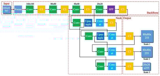 The schematic diagram of the YOLOv5 network architecture is shown in Figure 3, which consists of four parts: the network input, the feature extraction backbone network, the feature fusion neck network, and the network output [31]. The backbone serves as the foundation for understanding the input image’s content, the neck network component further processes and refines feature maps before they are used for object detection, and the output network is used to identify and locate objects within the image.