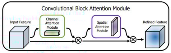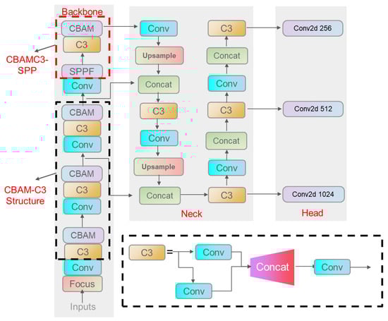 Clausen [32] et al. proposed the Convolutional Block Attention Module (CBAM): a simple and effective attention module for feed-forward convolutional neural networks. It is a lightweight and general-purpose module. It can be seamlessly integrated into any CNN architecture and can be trained end-to-end with the underlying CNN with the structure, as shown in Figure 4. The model structure is modified using CBAM, which is added after each C3 module of the backbone network to better fuse channel and spatial information, focus on defective targets, and improve network detection, especially for different bias points, in addition to improving the feature pyramid. The feature map after the fourth down-sampling of the backbone network is injected into the feature pyramid through the CBAM module to improve the perceptual field of the target and reduce the information loss in the fusion process, as Figure 5 shows.