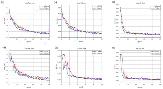 Variation of box loss, object loss, and classification loss of the model during the training process. (a–c) Loss curve of the original YOLOv5 model. (d–f) Loss curve of the CBAM-YOLOv5 model.