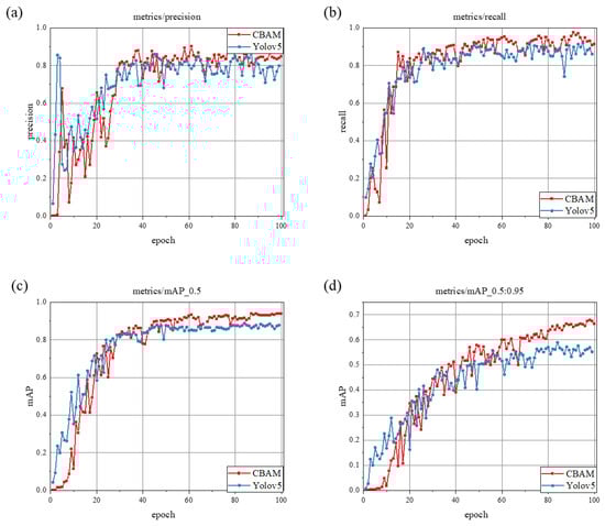 Precision (P), recall (R), and mAP variation in the model during the training process, the red line represents the CBAM-YOLOv5 model, and the blue line represents the original YOLOv5 model:(a) Precision, (b) Recall, (c,d) mAP with different IoU.
