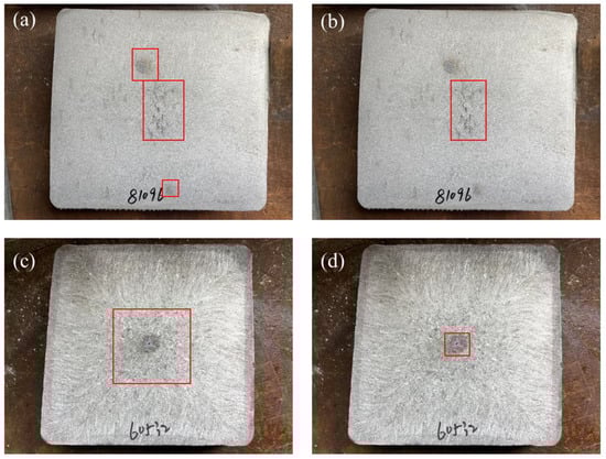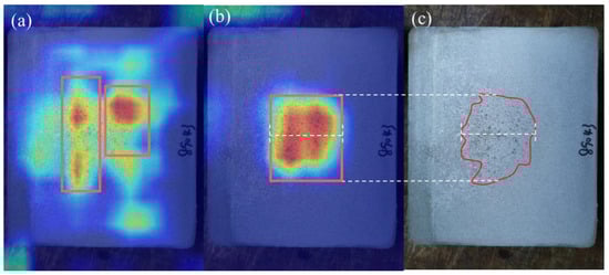 The GradCAM generates a heatmap that highlights the regions in the input image where the model’s attention is concentrated. This heatmap is superimposed on the original image, making it visually evident where the model is making its predictions. By examining the heatmap, one can easily identify the areas within the image that are most relevant to the model’s defect detection decision. This localization is crucial for understanding which parts of the image the model considers when identifying defects. This verification method validates the model’s effectiveness and highlights the importance of attention mechanisms in improving recognition accuracy and robustness. Typically, the area in Figure 10c would be manually measured and the longest edge would be compared to the cast billet’s dimensions for calculation. In contrast, our method in Figure 10b directly frames the largest area and allows the computer to calculate the rating. This method significantly speeds up the rating process while maintaining the same level of accuracy as manual measurement. Moreover, this method produces numerical data, avoiding human subjectivity in the rating process.
