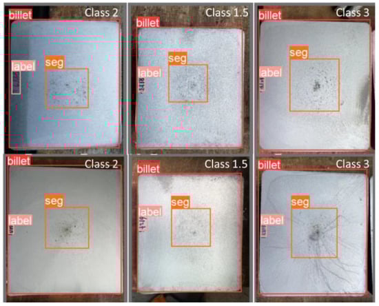 As shown in Figure 11 for the CBAM-YOLOv5 inspection effect, in the cast billets, both the defect area and the billet as a whole are marked in order to achieve the rating requirements. Since the scale information is not given in the figure, the pixel scale is used as the basis for the size division, and the defect area is compared with the overall size of the billet according to the values given in Table 1, with an aim of obtaining the defect grade automatically.