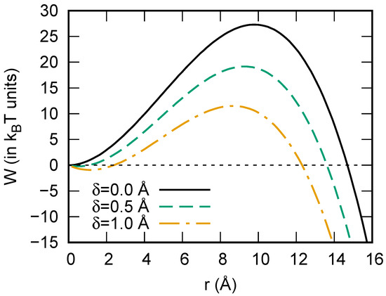 i.e., two solutions for the critical size exist. The work of cluster formation (W) changes in with Tolman length () and reaches a minimum before reaching its maximum at the critical size, as shown in Figure 1. W reaches its maximum at the nucleation barrier () for homogeneous nucleation (solid line in Figure 1, ) and decreases with (the dashed line in Figure 1 corresponds to Å, and the dotted–dashed line corresponds to Å).