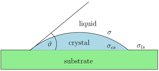 Schematic representation of the formation of a crystalline nucleus on a flat surface. and denote the interfacial energies on the liquid–solid and crystal–substrate interface, respectively, is the surface energy on the liquid–crystal interface, and is the wetting angle.