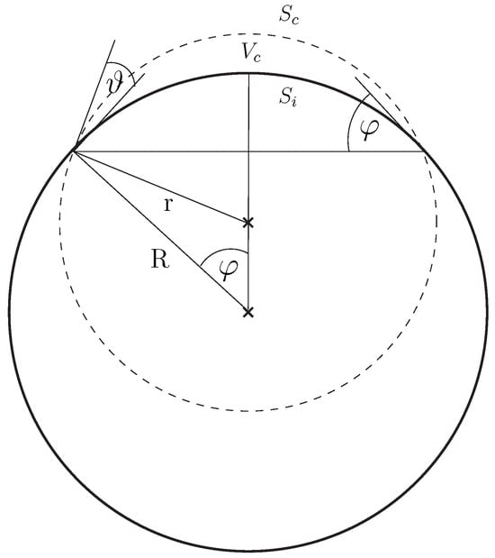 In this section, we present a derivation of analytical formulas for the energy associated with the formation of the nucleus on a convex substrate. Some relations are evident from Figure 5, where is the wetting angle; r is the nucleus radius; R denotes the substrate radius; and stand for the surface area between nucleus–melt and substrate–nucleus interface; and is the nucleus volume. The following relations hold: , ,