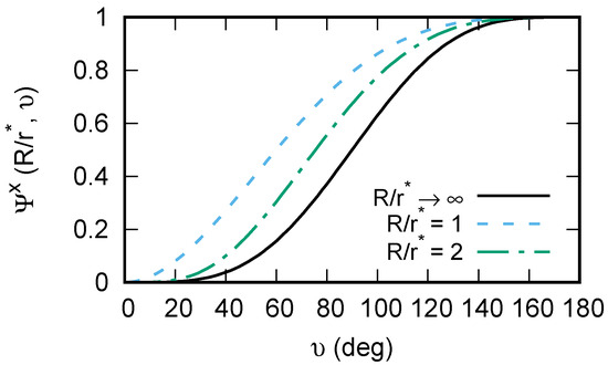 The volumetric contribution () to the work of cluster formation a on convex substrate () follows from Equations (5) and (A3),