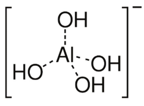 The most important and widespread process for the production of alumina is the Bayer process, which uses bauxite as raw material. There are four main stages of this process [1], namely, leaching, filtration, crystallization, and calcination, which lead to formation of aluminates at elevated temperatures. Sodium aluminate is an inorganic compound that is used as an efficient source of aluminum hydroxide in the Bayer process of producing alumina. Pure sodium aluminate (anhydrous) is a white crystalline solid that has the abbreviated formula NaAlO2. Commercial sodium aluminate is available as a solution or as a solid [2]. The structure of the aluminate ion is shown in Figure 1.