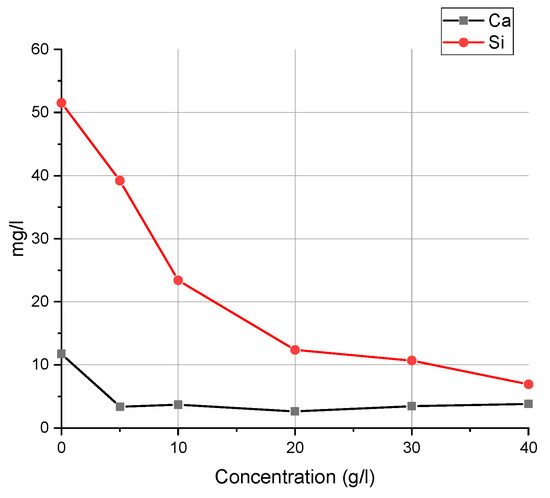Influence of lime concentration on the change in Si and Ca content (T = 80 °C, 120 min, c = 5–40 g/L).