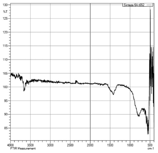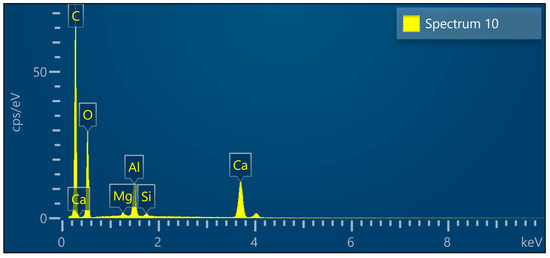 At the wavelength of 805 cm−1, a medium-sized signal was observed, which originated from the symmetric stretching of the Si-O-Si bond in hydrogarnet (Ca3Al2(SiO4)3−x(OH)4x). This confirmed the presence of silicon compounds that were not present in the starting lime. The calcium compound hydrogarnet (CaO·Al2O3·6H2O) was characterized by an absorption band at the wavelength of 540 cm−1, which originated from the vibrations of the Ca-O bond. The absorption band in the infrared spectrum that appeared at the wavelength of 3660 cm−1 was due to the stretching of O-H bonds.
