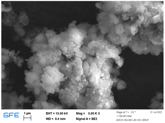 Additional morphological and structural analysis were performed using SEM, EDX, and XRD analysis, as shown in Figure 7, Figure 8 and Figure 9. The obtained particles agglomerated in irregular and round forms, with particle size being above 1 µm.