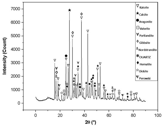 The sample analyzed contained predominantly a Ca-carrying hydrogarnet (Ca3Al2(OH)12). The other main phases were calcite, aragonite, and gibbsite. Portlandite and vaterite were minor constituents (<10%). The wide peak at 2Θ = 10–16° indicated the presence of an amorphous phase, possibly amorphous Ca(OH)2. Other minor phases were nordstrandite, dickite, quartz, perovskite, and possibly rhomboklas. There was little hematite and goethite. Cristobalite might be another minor constituent in the analyzed sample.