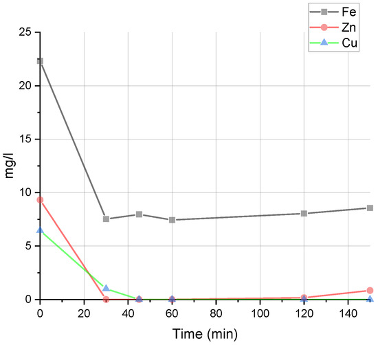 The results showed a significant decrease in the concentration of iron, zinc, and copper over time compared to the initial value. The concentration of copper already dropped to zero after 40 min. The concentration of iron had the lowest value after 30 min, and the concentration then started to increase, which can be explained by desorption or dissolution from the surface of the seed crystals. The concentration of zinc was already equal to 0 after 30 min, but after 120 min, its concentration started to increase because of the same redissolution process. Therefore, the time of 45 min can be considered as optimal for the best purification effect.