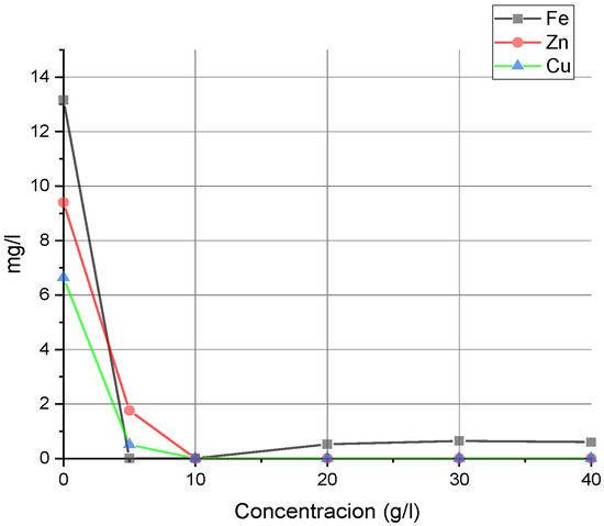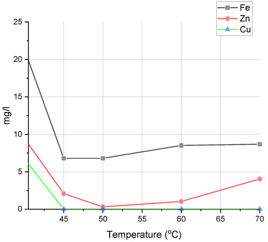 Changes in Fe2+, Zn2+, and Cu2+ concentrations depending on temperature (120 min, 5 g/L).