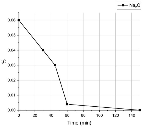 The content of Si first decreases, then increases and decreases again over time, and has the lowest value at 120 min, while the content of Ca is the lowest after 60 min and its value is constant but lower compared to the initial one. The reason for this is the formation of insoluble tricalcium—aluminate (Ca3Al2O6). It is clearly visible from Figure 3 that at a temperature of 80 °C and an amount of lime of 20 g/L, the time after which the process should be stopped is 60 min.