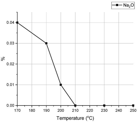 At temperatures below 50 °C, calcium removal was very slow. It can be seen from the previous diagram that the concentration of calcium was the lowest at 50 °C, where its concentration was 4.16 mg/L. With a further increase in temperature, the concentration of Ca increased, which can be explained by the fact that calcium compounds dissolve in sodium aluminate solution at higher temperatures. However, all values were lower compared to the initial value of 10.64 mg/L. Unlike calcium, the purification of silicon was more intense at higher temperatures, while the minimum concentration was at 70 °C. All values were well below the initial value of 43.88 mg/L. One of the mechanisms for extracting silicon is the formation of DSP (desilication product), which is actually a compound of sodium aluminosilicate (a type of zeolite sodalite). This process represents a loss of sodium and aluminum in conventional processes. Our new innovative strategy in this work is the multistep cleaning of the aluminate solution with special reference to the removal of impurities from the second stage. It is known from the literature that the kinetics of sodium aluminosilicate (DSP) formation as well as crystallinity increase with increasing temperature, as shown in [6]: