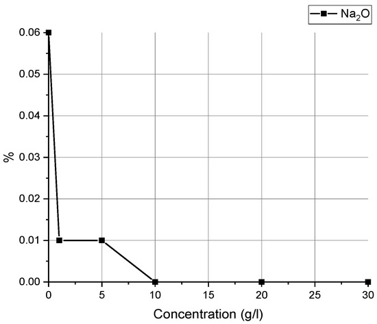 The influence of the concentration of added lime was determined at the following process parameters: T = 80 °C t = 120 min, and concentration of lime = 5–40 g/L. Even with different concentrations of added lime, the amount of sodium present in the solution did not change and remained the same as in the initial sample. As the amount of added lime increased, the content of Al2O3 in the solution decreased. By increasing the concentration of calcium present, there was a more intense reaction with aluminum from the aluminate, which resulted in the formation of insoluble tricalcium aluminate. The assumption is that this phenomenon occurs by two possible mechanisms.