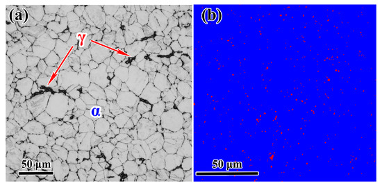 Microstructure of the as-forged bearing steel: (a) metallographic image, with the ferrite matrix (light grey) and small amount of block austenite (dark grey) located at the boundaries; (b) phase distribution map of electron backscatter diffraction (EBSD), with the ferrite matrix marked with blue and small amount of block austenite marked with red.