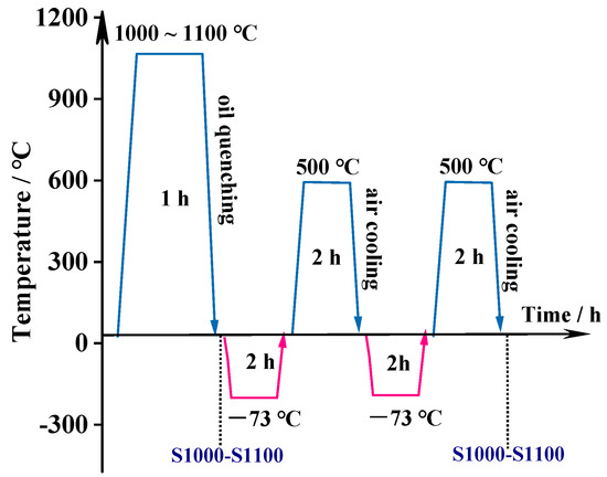Illustration of the heat treatment scheme including the solution treatment for 1 h in the temperature range from 1000 to 1100 °C followed by quenching into oil, and then two cycles of cryogenic treatment at −73 °C for 2 h and tempering at 500 °C for 2 h, with final air cooling to room temperature.