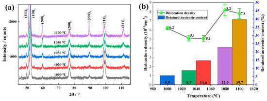(a) XRD patterns, and (b) austenite content and dislocation density of samples T1000–T1100.