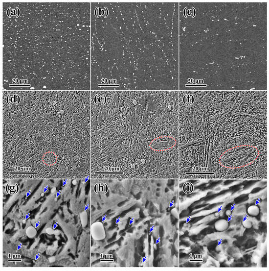 BSE images of secondary phases (a–c), and high-resolution SEM images of the martensitic matrix (d–i) in T1000 (a,d,g), T1050 (b,e,h), and T1100 (c,f,i): martensite lamellae, secondary phase particles and nano precipitates are marked by dotted line ellipticals and blue arrows respectively.