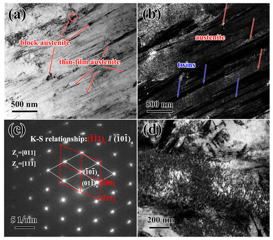 Within the microstructure, two kinds of austenite with different morphologies were also detected, namely block austenite and film austenite, as shown Figure 5a. Corresponding dark-field images and selected-area electron diffraction (SAED) patterns of the two kinds of austenitic phases are shown in Figure 5b,c. The thickness of film austenite was measured to be about 0.2–0.3 μm. The block austenite exhibits a Kurdjumov–Sachs (K–S) orientation relationship with the martensite, i.e., (−1 −11)γ∥(−10 −1)α and [011]γ∥[111]α. The lattice constants of martensite and austenite were measured to be 0.293 nm and 0.358 nm, respectively. In addition, a high dislocation density was found in the martensitic matrix, as shown in Figure 5d.