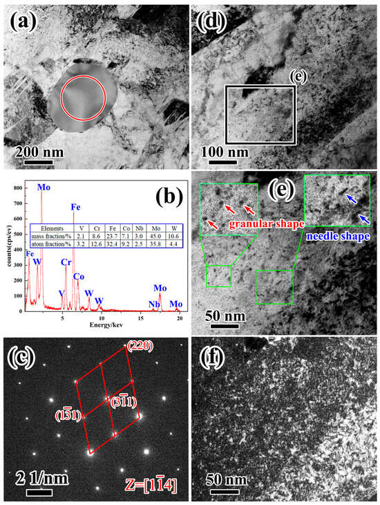 Figure 6 shows TEM observations of the secondary phase and precipitates in sample T1050. One of the large granular carbides (Figure 6a), the undissolved secondary phase, is nearly elliptical, with a long axis measuring about 500 nm and a short axis measuring 400 nm. Selected-area electron diffraction (SAED) patterns (Figure 6c) indicate that the diffraction spots are from M6C carbides, which EDS measurements show to mainly contain Mo, Fe, W, Cr, Co, Nb, and V, as shown in Figure 6b. A number of nano-sized precipitates with either a granular or needle shape are also observed in the matrix, as shown in Figure 6d–f. Due to the fine scale of these precipitates, HRTEM (high-resolution TEM) characterization was additionally carried out for further analysis.