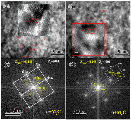 Figure 7 shows HRTEM images of nano-scale precipitates. Diffraction spots from the precipitates, obtained via fast Fourier transform (FFT) in the red areas in Figure 7a and Figure 7b, are shown in Figure 7c and Figure 7d, respectively. It is seen that the precipitates in Figure 7a,c are M2C carbides with a hexagonal structure (hcp), which is consistent with the results in Refs. [20,24,25]. The M2C carbides are present with a needle shape of a width of about 2~3 nm, and obey an orientation relationship with the martensitic matrix given by [01 - 11]M2C∥[001]α and (0 - 112)M2C∥(−110)α. The precipitates in Figure 7b,d are identified as M6C carbides, with a face-centered cubic structure (fcc), and a lattice constant equal to 1.127 nm. These M6C carbides are present as spheroidal particles with a diameter of 2~3 nm and an orientation relationship with the martensitic matrix given by [114]M6C∥[001]α and (−31 - 1)M6C∥(−110)α. M6C carbides were also reported in a S53 steel variant and a Cr–Co–Mo–Ni bearing steel [26] as primary carbides albeit with a much larger size of hundreds of nanometers. In addition, Dyson [27] reported the precipitation of M2X and M6C carbides in a 12%Cr–6%Mo–10%Co stainless maraging steel, and confirmed a carbide reaction of M2X→M6C, as was found previously in high-speed steels [28].
