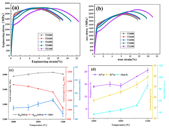 Mechanical properties as a function of solid solution temperature: (a) engineering stress–strain curves, (b) true stress–strain curves, (c,d) plots of hardness, tensile strength, yield strength, elongation, reduction area, and impact absorbed energy versus solid solution temperature.