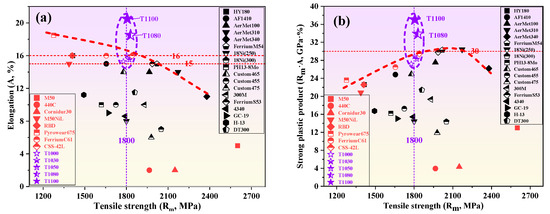 Plots of elongation (a) and strong plastic product (b) versus tensile strength for different steels: the mechanical of ultrahigh strength steels, stainless bearing steel and this novel steel plotted by black, red and purple scatter points, respectively.