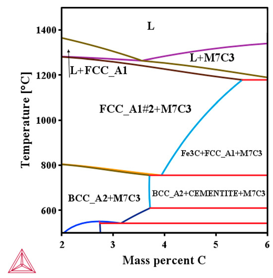 - Jain, A.-S.; Chang, H.; Ahmad, H.; Ma, X.; Zhang, M.-X. Effect of solutes on the formation of primary carbides during solidification of hypereutectic high chromium cast irons through thermodynamic modeling. J. Mater. Sci. 2022, 57, 1429–14447. [Google Scholar] [CrossRef]